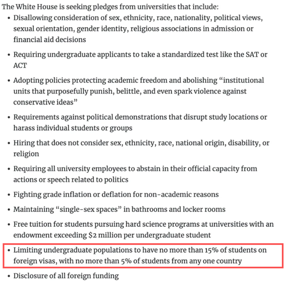 10月1日,美国联邦政府向九所顶尖高校发送《高等教育学术卓越契约》备忘录,要求高校调整招生政策以换取联邦资助优先权,明确限制留学生比例不超过15%,单一国家生源不超过5%,进一步压缩了国际学生的入学空间。