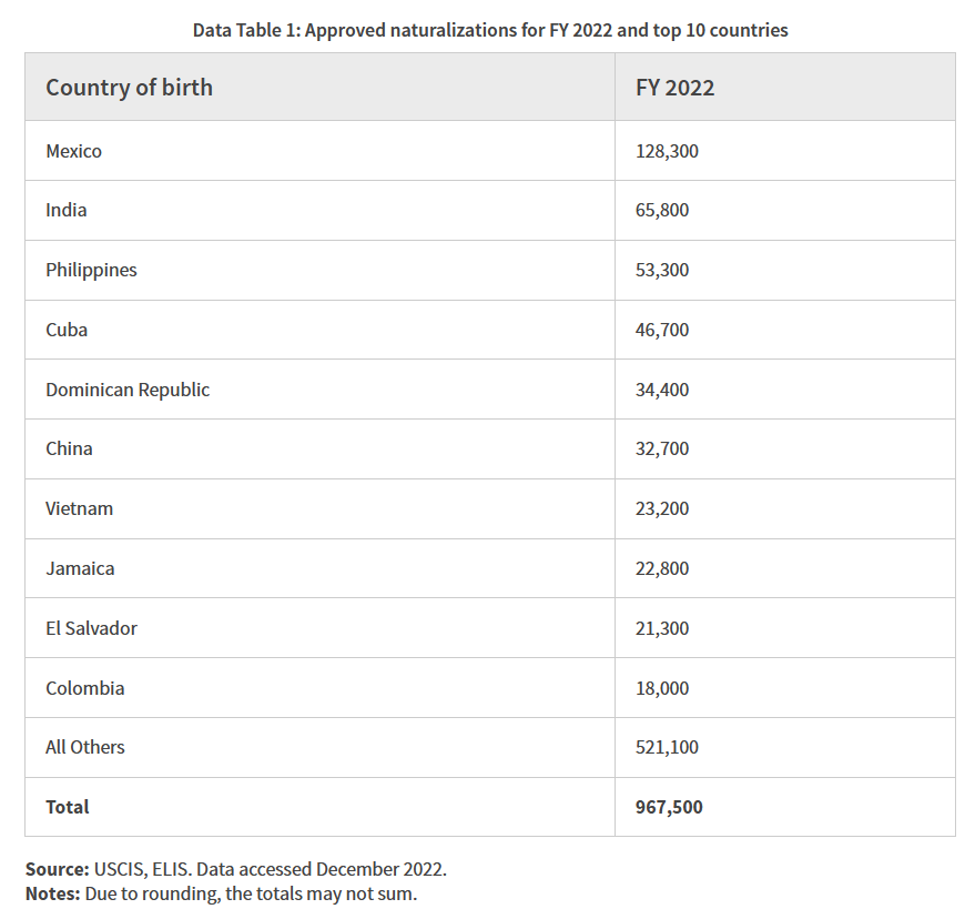 据美国公民及移民服务局(USCIS)的最新统计数据,2022财年,美国共接纳了967,500名新公民,这是自2008财年以来的最高水平,比去年增加了20%。在这些新公民中,中国公民占据了一席之地,共有32,700名中国公民在2022财年获得美国公民身份,成为新公民出生国的前六名之一。