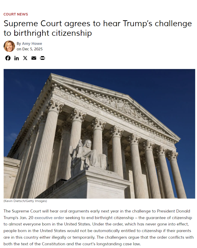 全年司法进程跌宕起伏:6月27日,美国最高法院裁定地方法官不得随意发布针对该政策的全国性禁令;7月10日,新罕布什尔州法官发布临时禁令阻止政策实施,并批准全国性集体诉讼;12月5日,最高法院正式受理相关案件,预计将于次年6月前作出最终裁决。