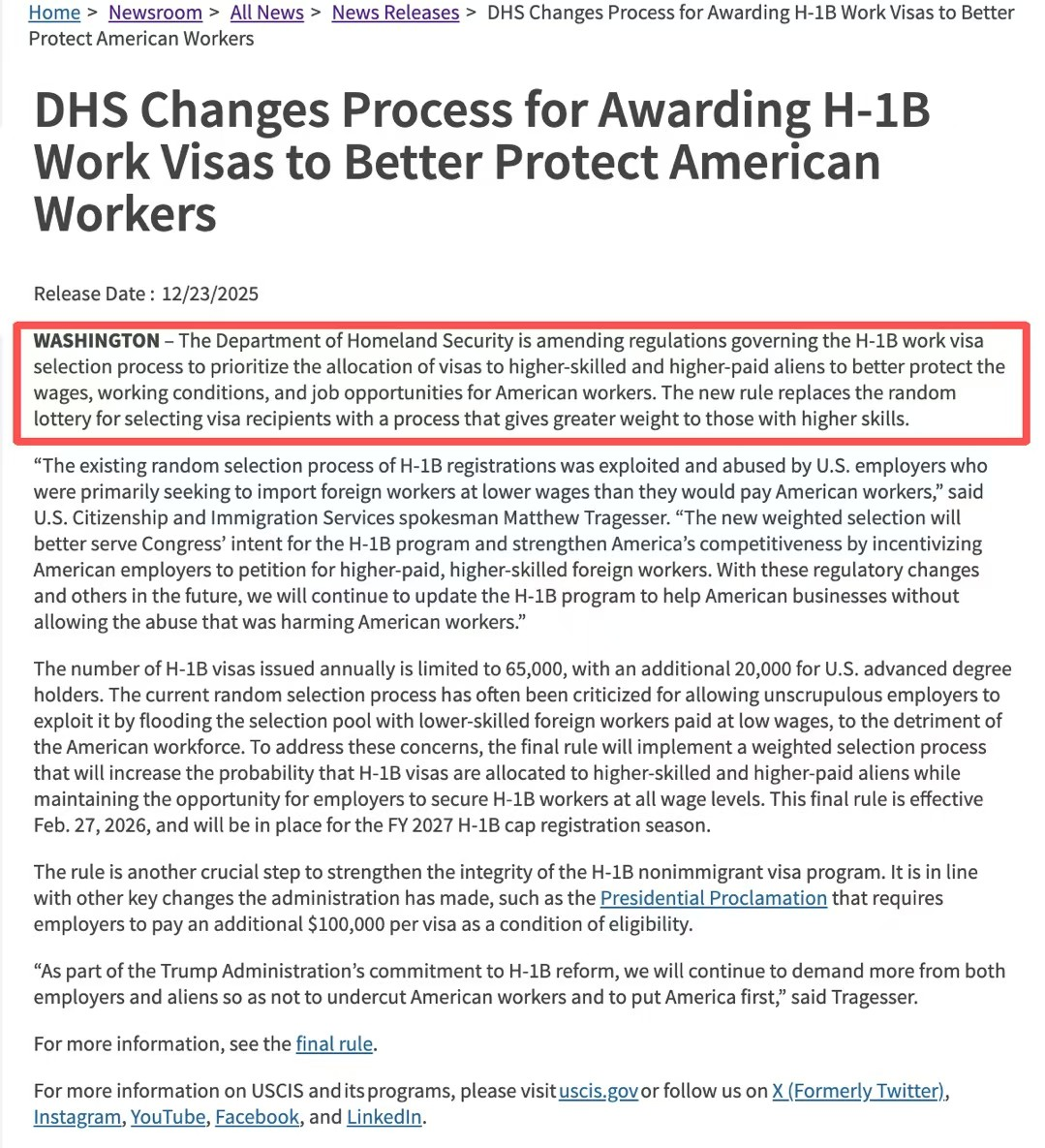 12月15日,移民局启动社交媒体审查机制,要求H-1B主申请人及其H-4配偶均需提交个人社交媒体账户信息供审查,进一步增加了申请的复杂度与不确定性。此次改革与政府强化移民审查、防范安全风险的整体导向相一致,未来工签申请的合规性要求将持续提高。